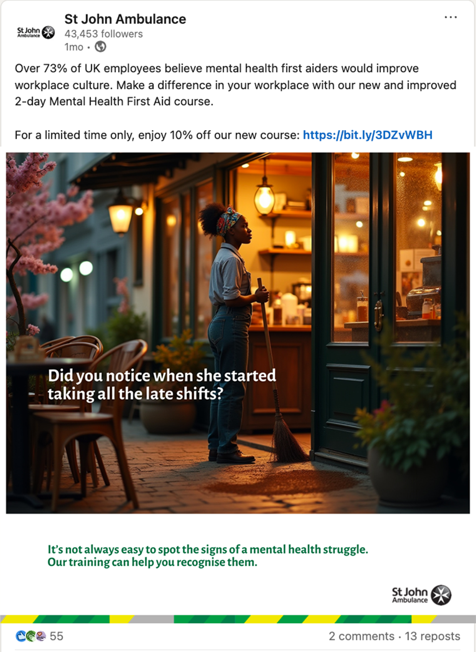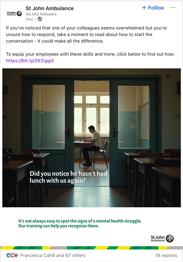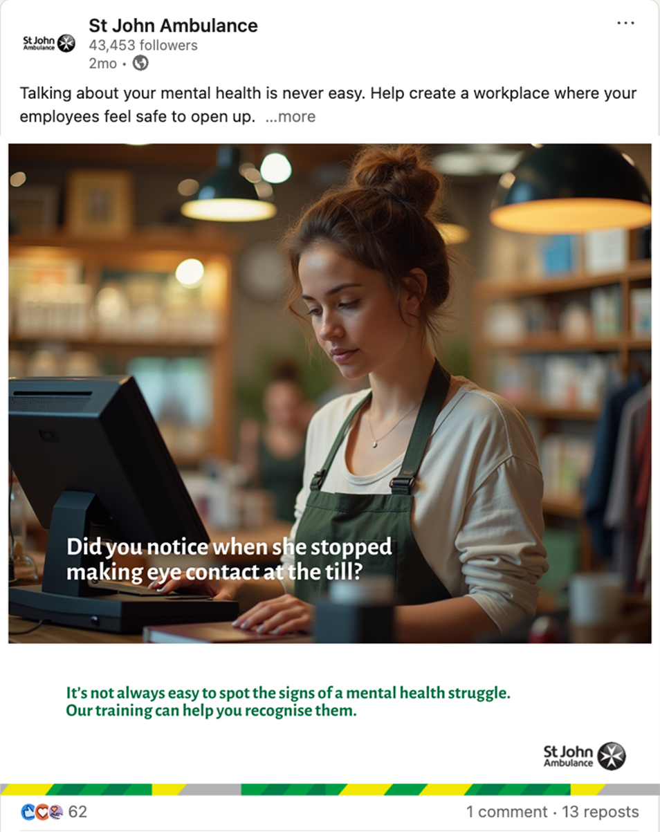 Create a B2B social campaign that encourages companies to sign up for St. John Ambulance's mental health training program.