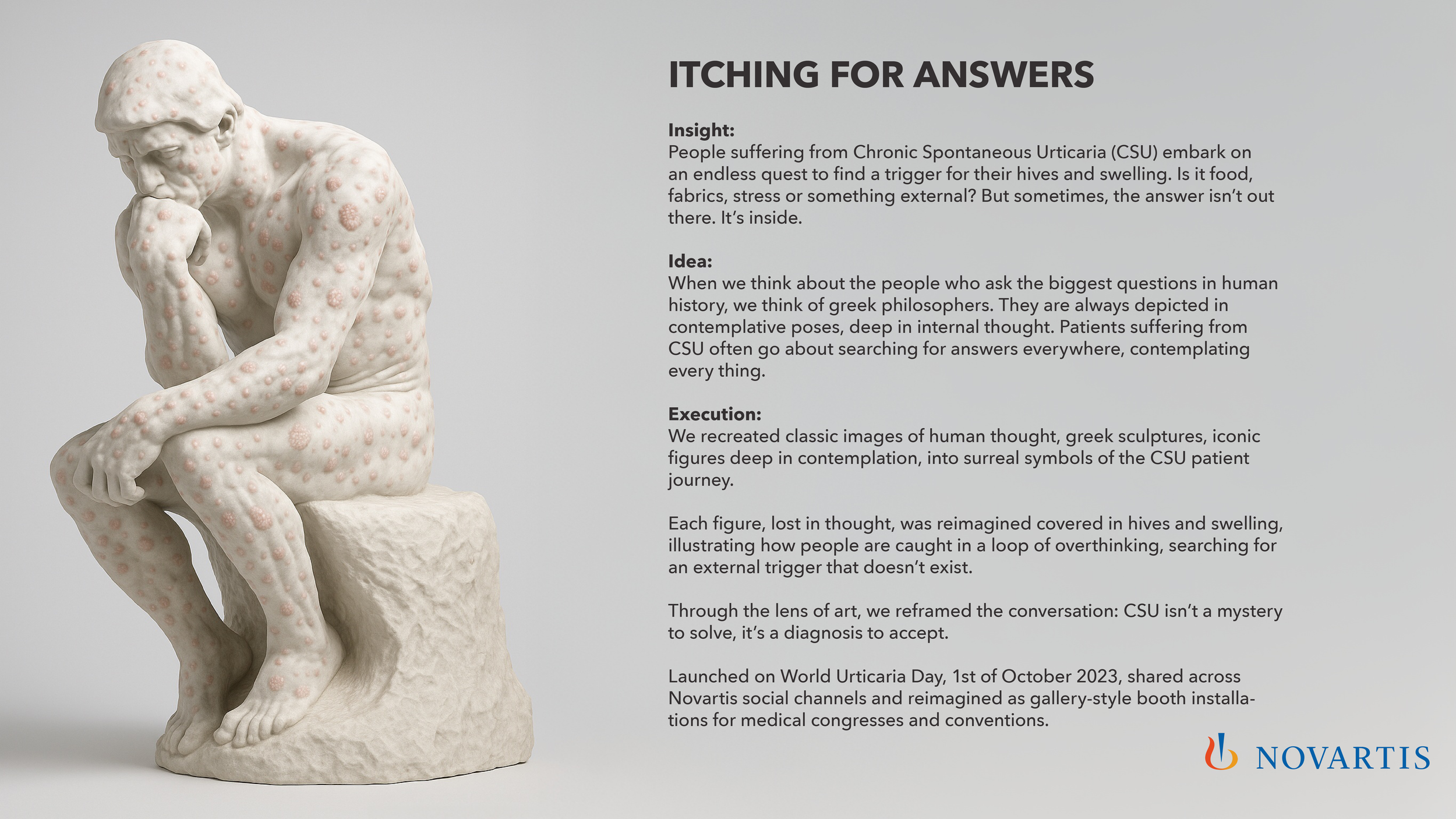 The brief was to develop a World Urticaria Day social campaign that reframes Chronic Spontaneous Urticaria (CSU) as "the simple answer to a complex riddle" for undiagnosed patients. The campaign had to help patients stop searching for non-existent triggers and instead recognise CSU as their condition, encouraging them to discuss it with their doctors.